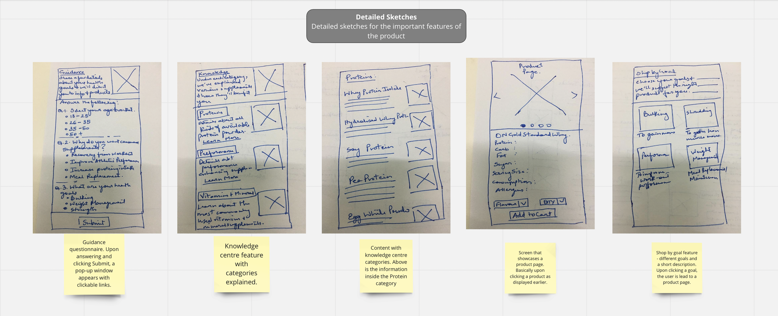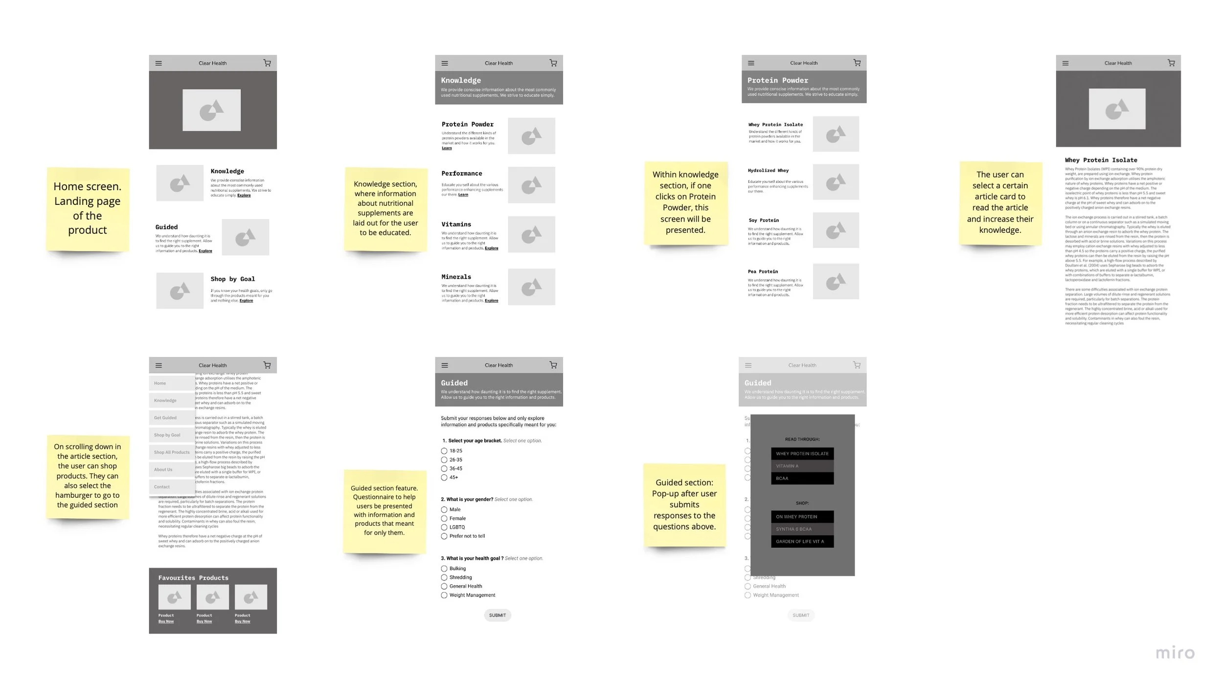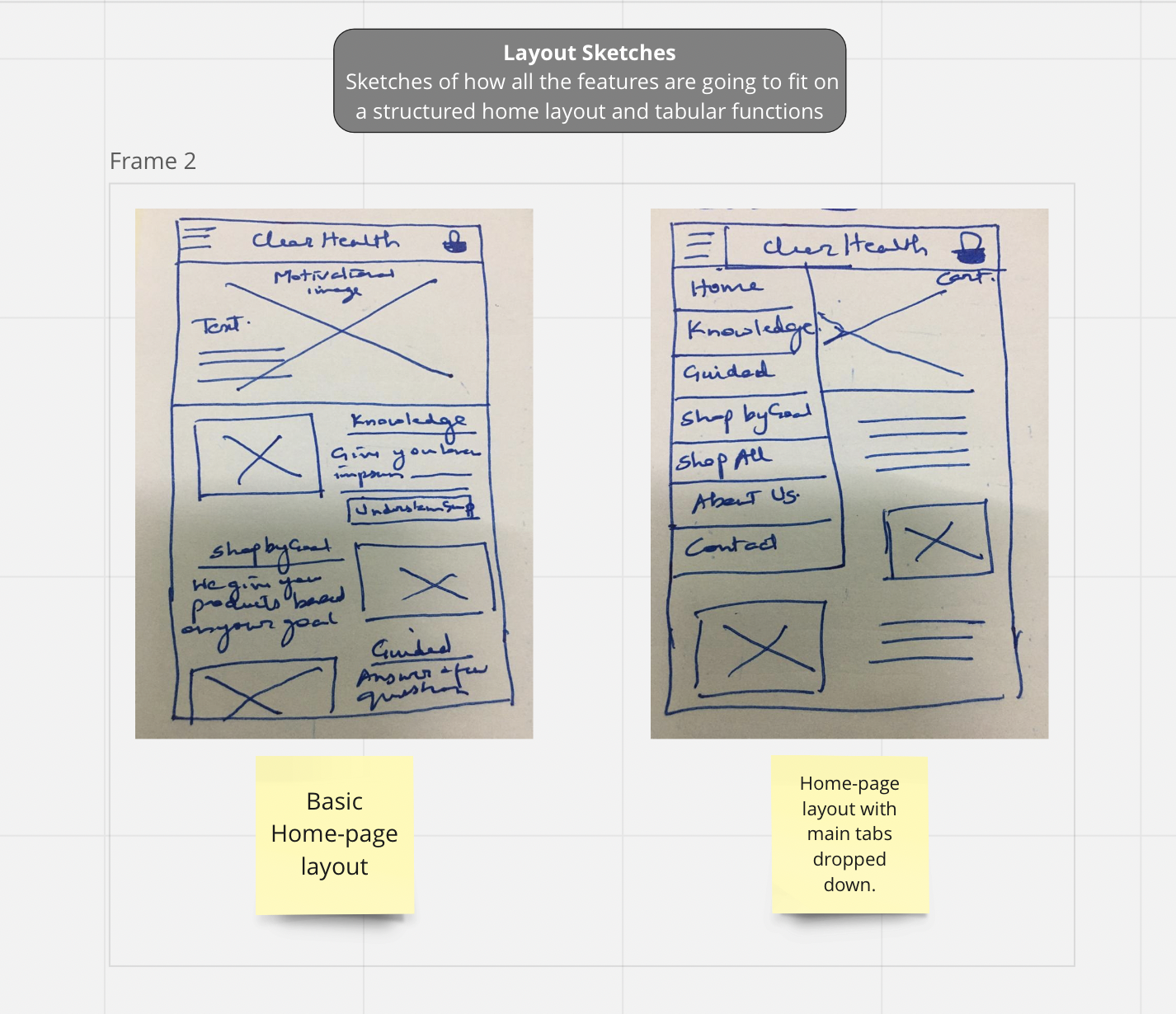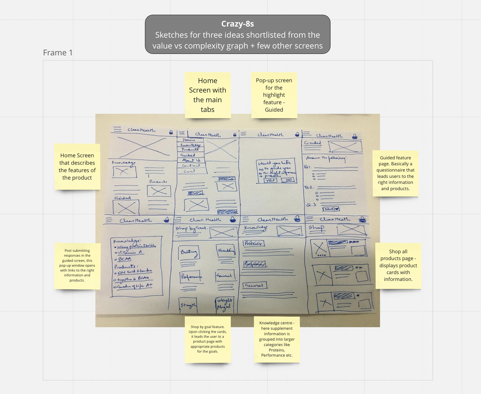 During the initial design phase, I employed various sketching techniques to generate and refine ideas for the application. The Crazy 8 method helped me to quickly generate a range of initial sketches, while the Detail Sketches method was used to refine specific features and create more detailed screens for the low-fidelity prototype. In the process of selecting a brand name, I conducted extensive research and gathered feedback from a range of stakeholders, including participants, friends, and family. Through this exploration process, I selected "Clear Health" as the brand name, which aligns with the application's focus on health and wellness and its goal of simplifying the supplement shopping experience for novice users. The name "Clear Health" conveys a positive and approachable image and emphasizes the application's commitment to providing clear, straightforward information about nutritional supplements.