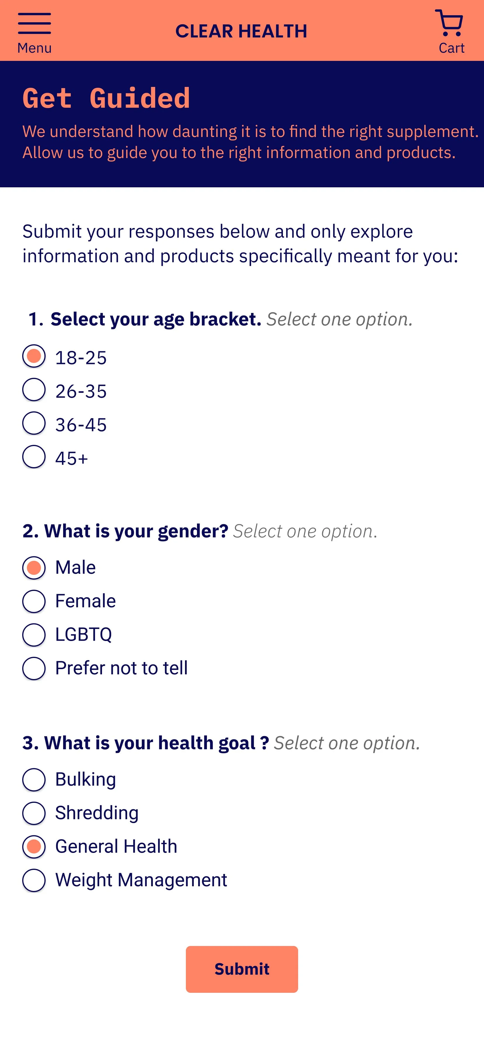 For users with little to no knowledge or experience in purchasing nutritional supplements, a guided experience providing personalized assistance and advice will improve the overall user experience and help to build trust in the product. By addressing the needs of novice users in this way, we can make nutritional supplements more accessible and appealing to a wider audience.