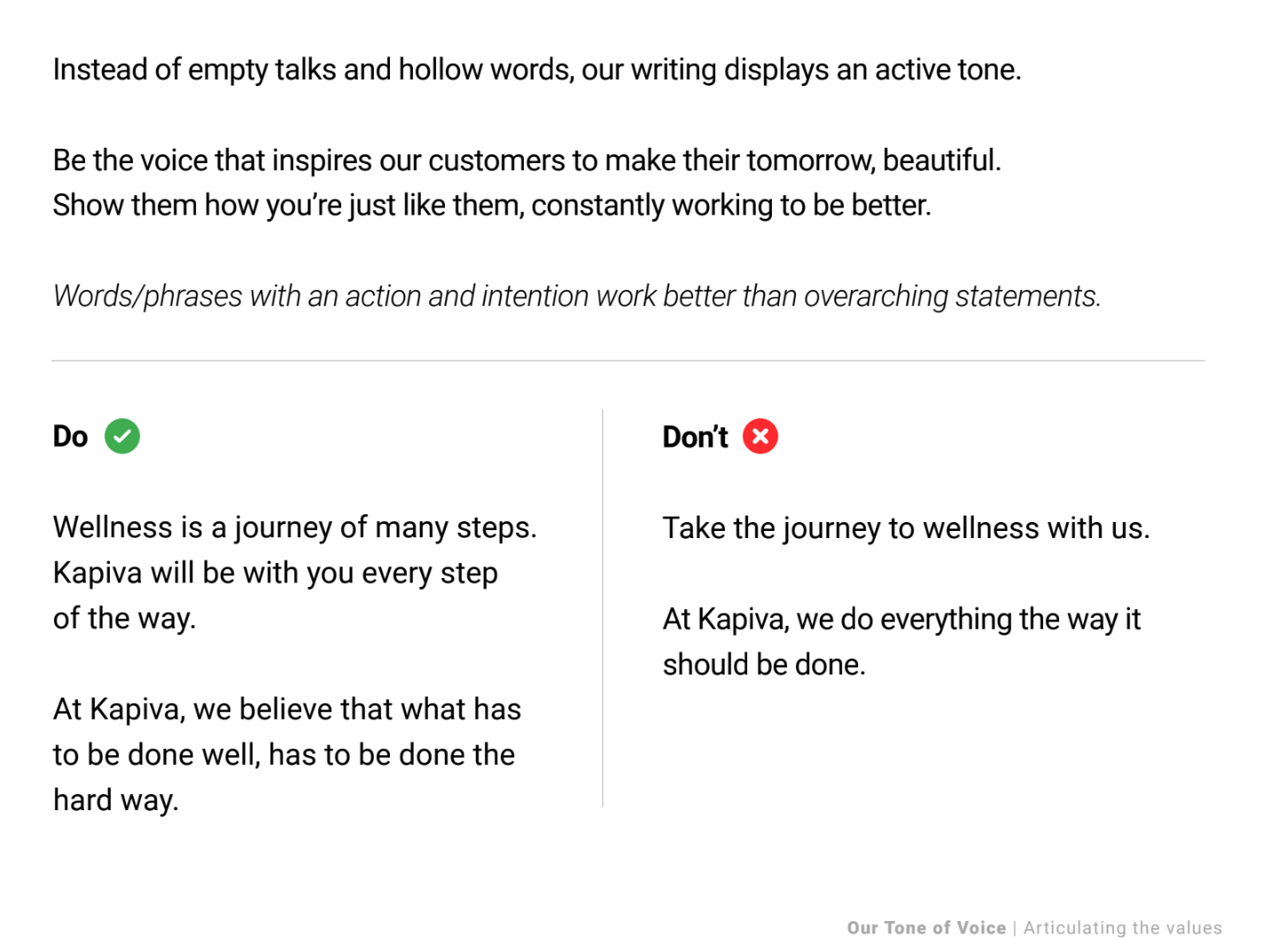 The tone of voice document would provide a framework to enable the reader of the document to write copy for Kapiva - whether it's for a hoarding, a social media post, or an internal mailer. It could be used by everyone writing for the brand.