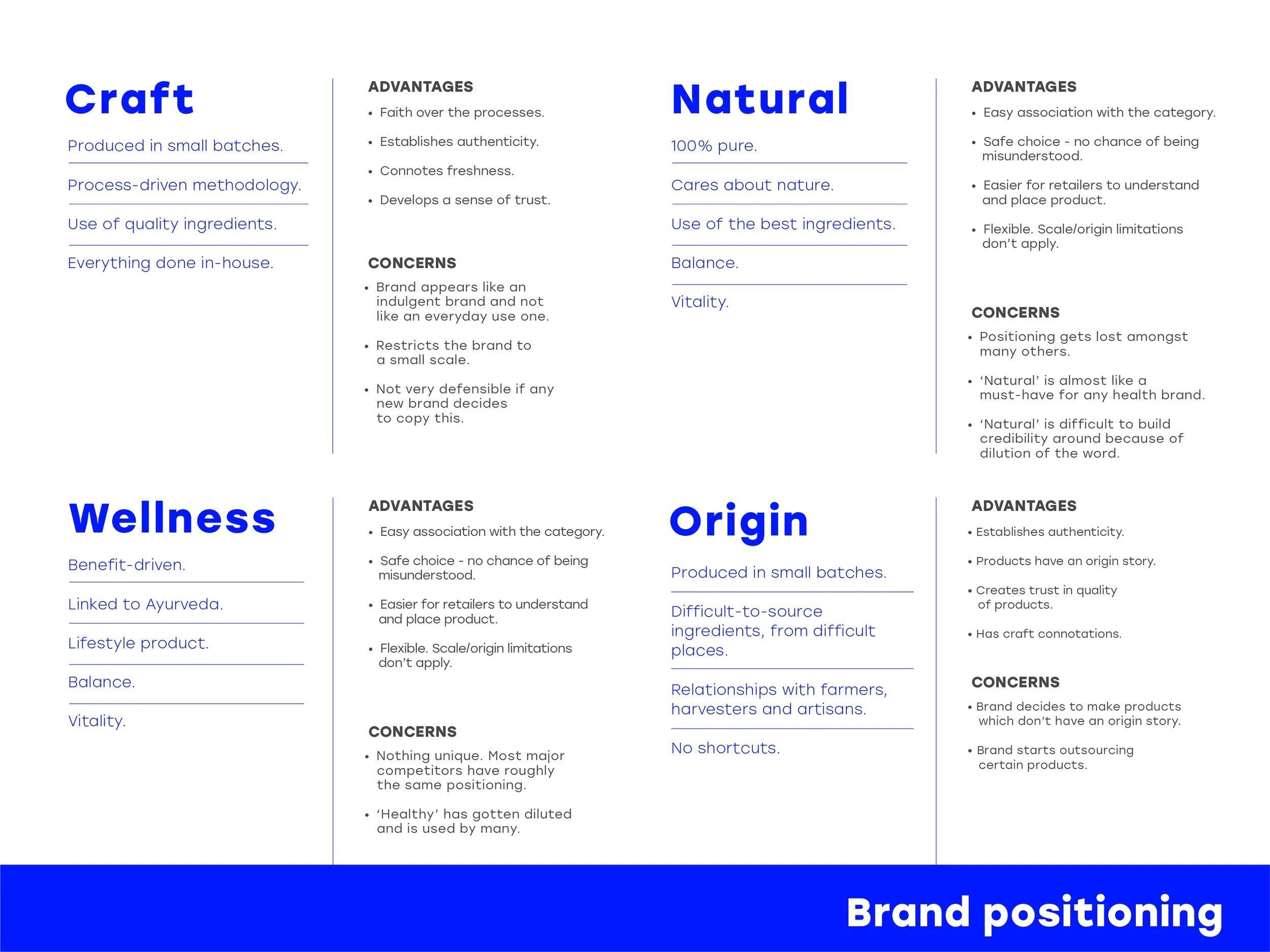 The information gathered, allowed us to explore a number of positioning directions and finally articulate a positioning fit for the brand. The set of images below taken from the brand positioning presentation showcases how we arrived at Kapiva’s new positioning.