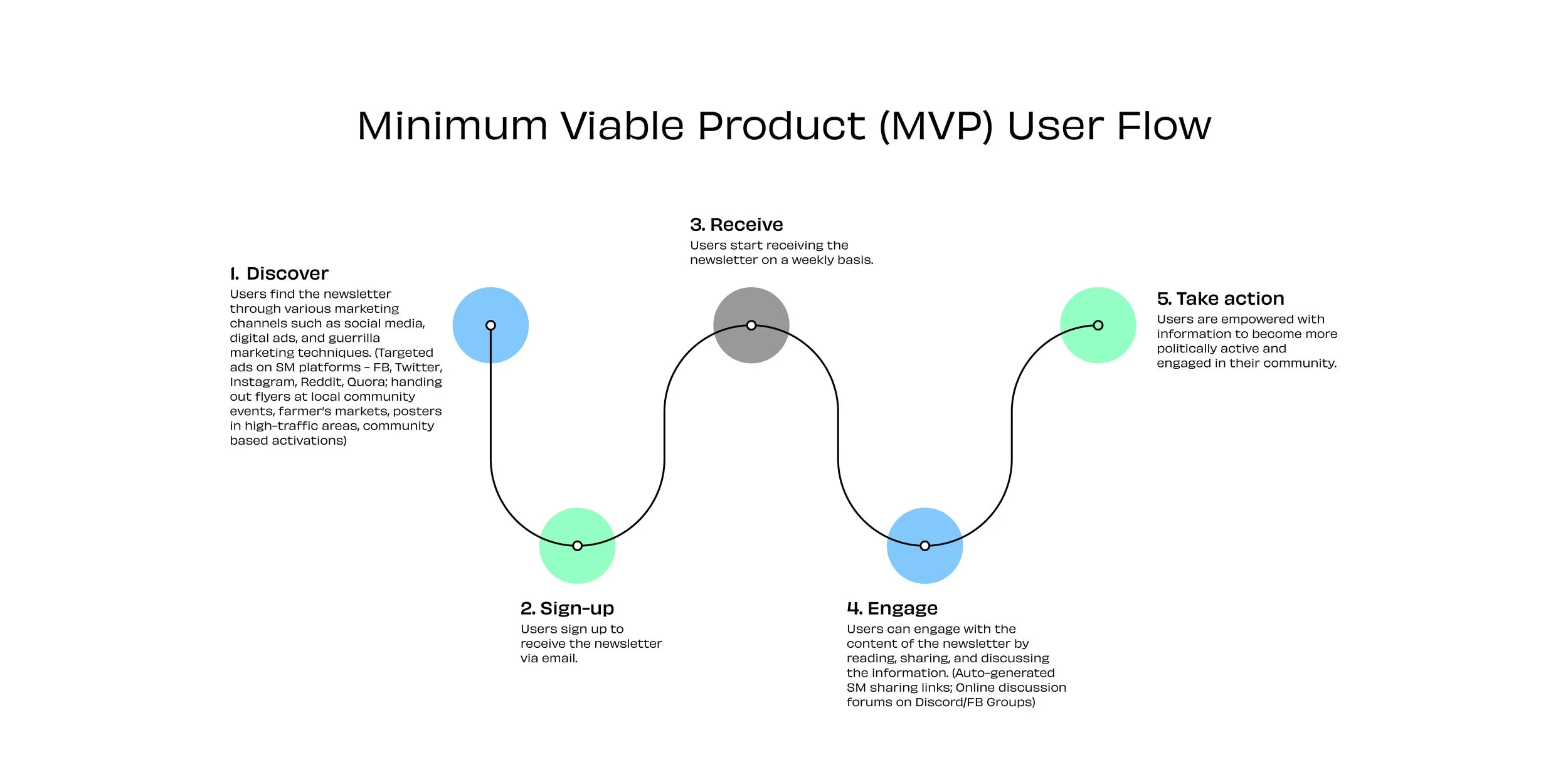 Our research process led us to ideate an MVP to address declining voter turnout in Canadian municipal politics, which we determined to be an email newsletter delivering succinct political news. The MVP would cover a variety of topics, including local elections, policies, and public meetings, empowering citizens to be more politically informed and engaged. The newsletter would also provide opportunities for citizens to get involved in local politics, encouraging them to become more politically active and engaged in their community. The MVP would ultimately address the needs and pains of citizens by providing them with a convenient and accessible way to stay informed about local politics and contribute to their community.
