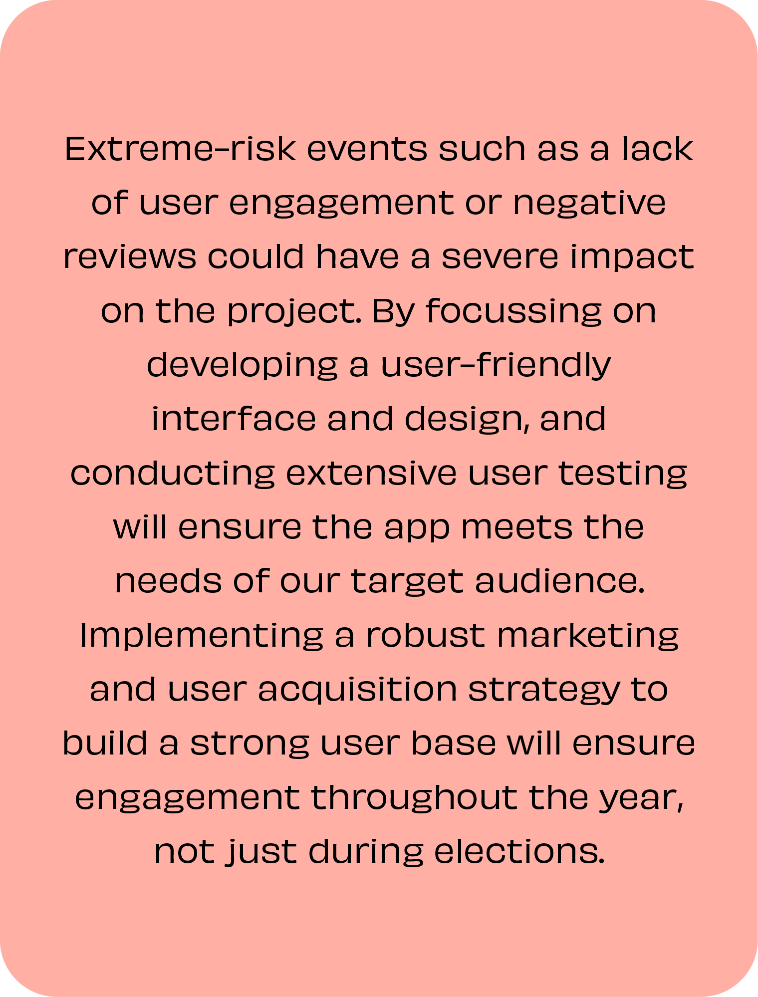 We identified several potential risks, each with a different level of probability and impact. By categorizing these risks based on their likelihood and potential impact, we can prioritize our risk management efforts and develop effective mitigation strategies.